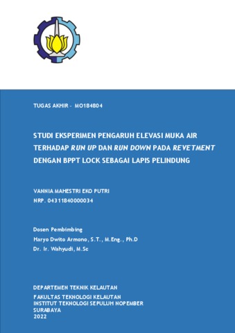Putri, Vannia Mahestri Eko (2022) Studi Eksperimen Pengaruh Elevasi Muka Air Terhadap Run Up dan Run Down Pada Revetment Dengan BPPT-Lock Sebagai Lapis Pelindung. Other thesis, Institut Teknologi Sepuluh Nopember.